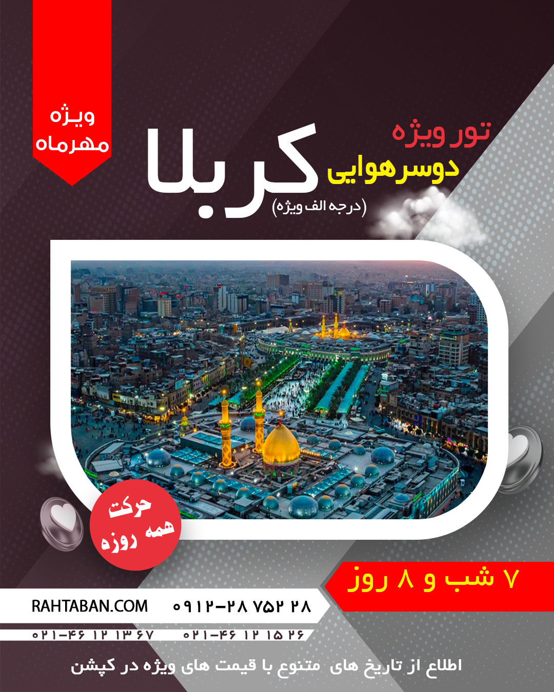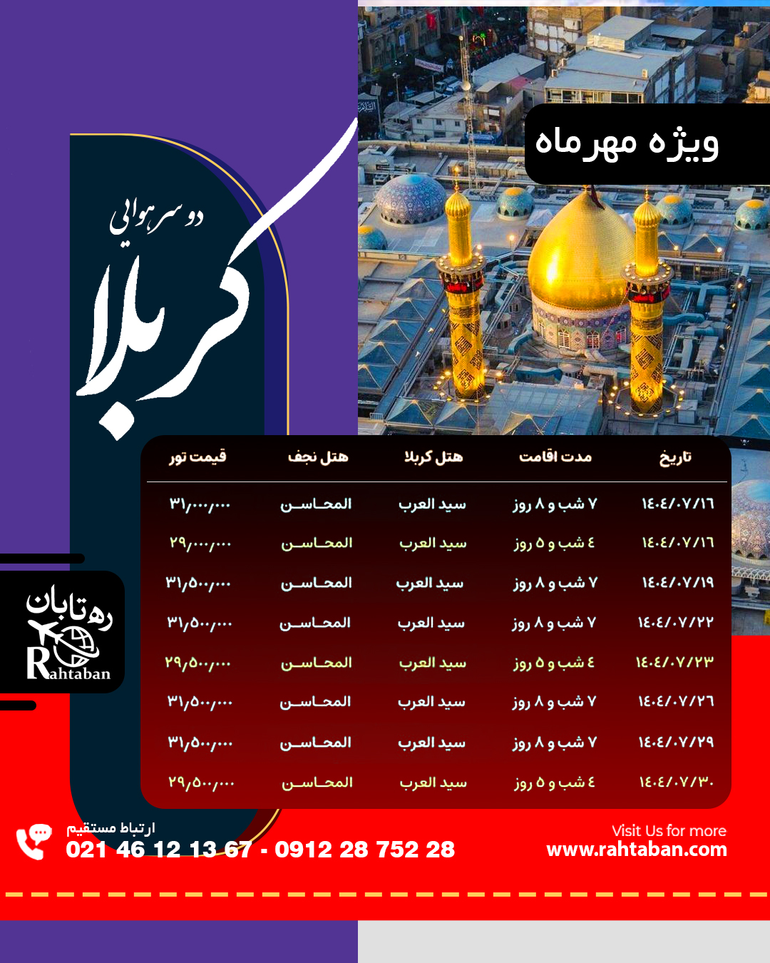 اطلاعاتی درباره تور کربلا تور کربلا را می توان یکی از بهترین تورهای زیارتی دانست که بیشترین زمان برگزاری این تور